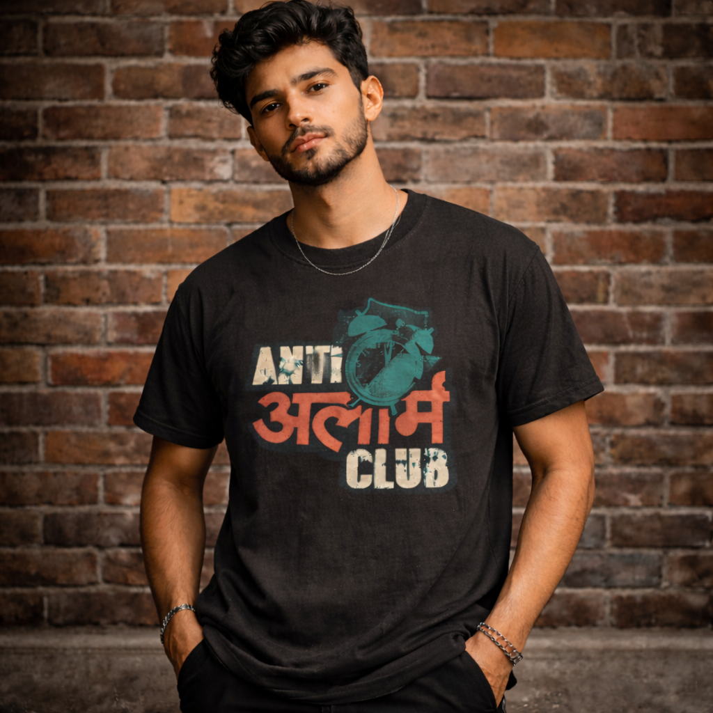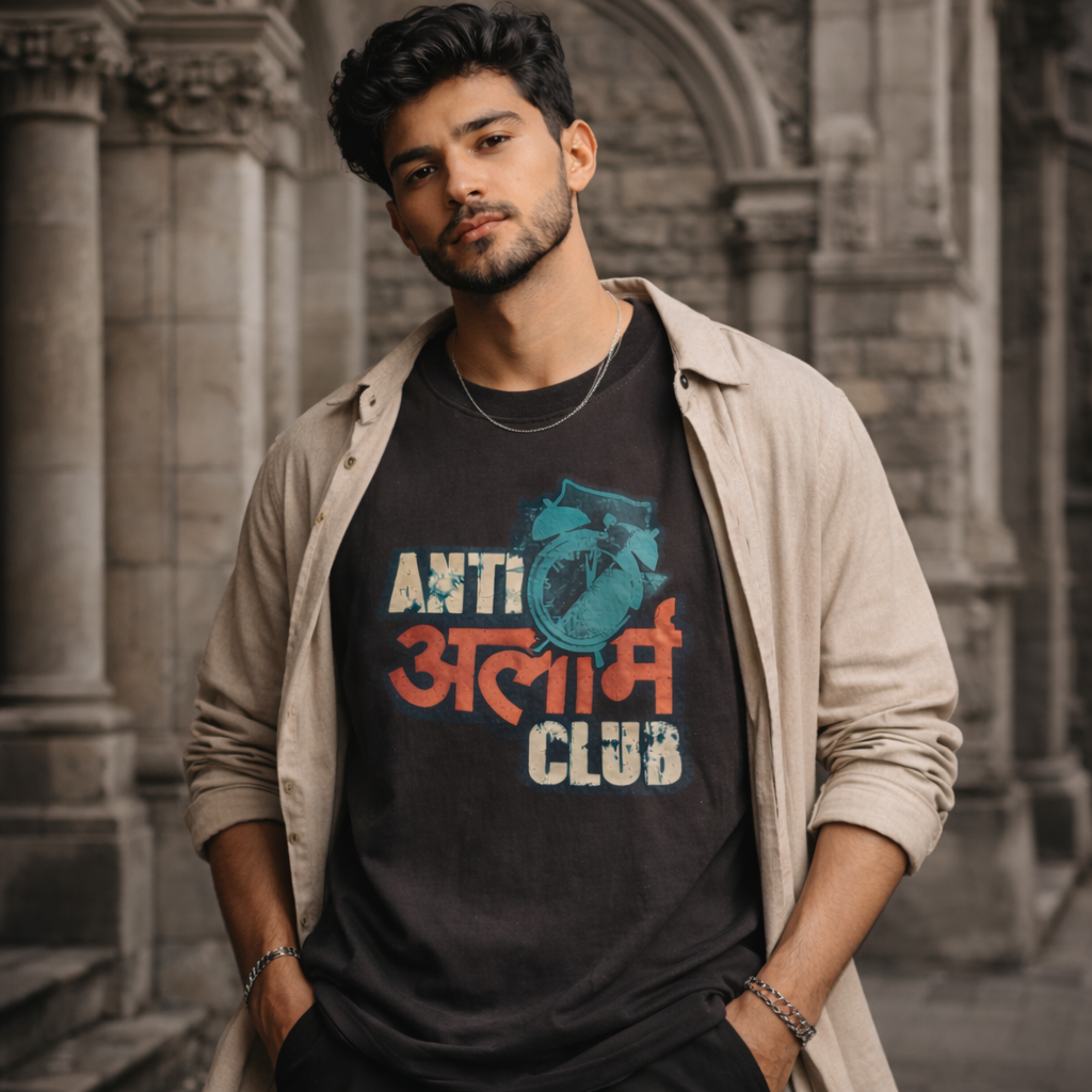 This tee features the statement “ANTI अलार्म CLUB” — a witty rebellion against early wake-ups, powered by relatable desi humour. The distressed typography and alarm clock graphic give it a vintage streetwear vibe, while the Marathi touch adds personality and cultural punch.